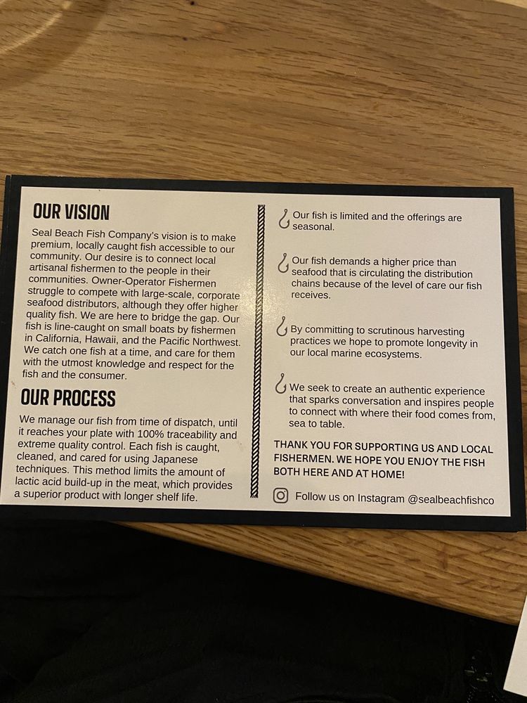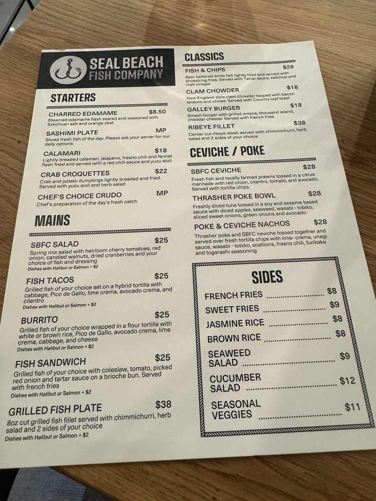 Welcome to Seal Beach Fish Company, a vibrant seafood haven located at 1025 Pacific Coast Hwy, Seal Beach, CA. This gem offers an impressive menu that showcases the freshest catches daily, thanks to their own fisherman. Starting off your meal, indulge in delicious Charred Edamame or the exquisite Sashimi Plate. The standout dishes include the flavorful Thrasher Poke Bowl and inventive Poke Ceviche Nachos, each at $28. Don’t miss the acclaimed Crab Croquettes for $22—a favorite among patrons.